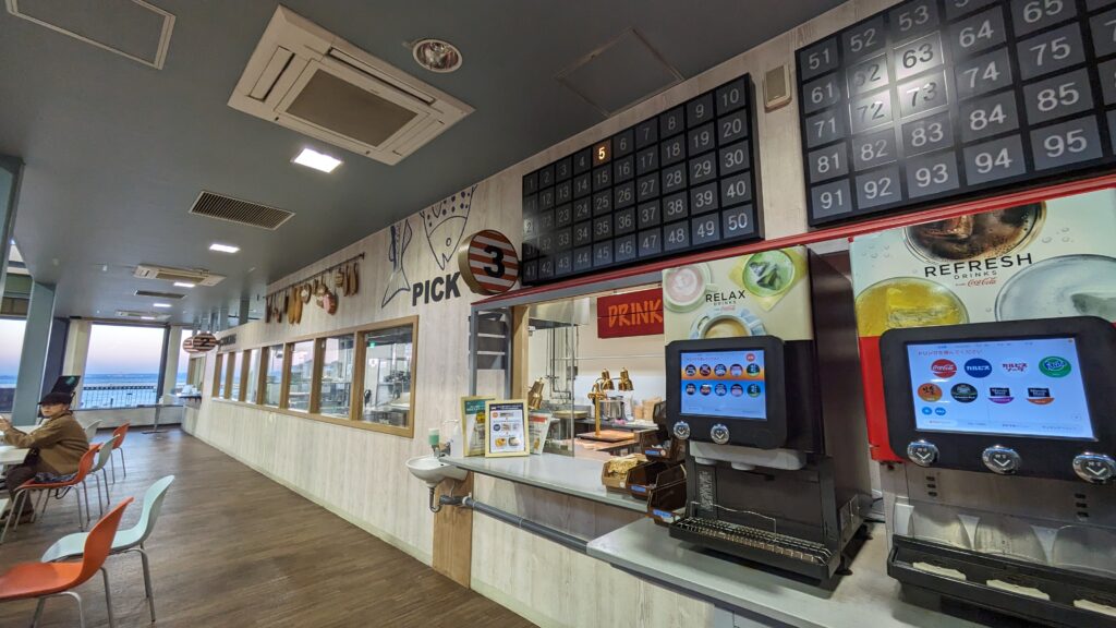 最後はこちらで調理後の魚を受け取ります。ソフトドリンクはドリンクバーになっています。