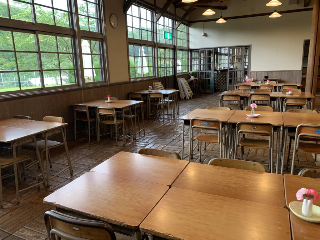 The interior of the restaurant is an open-air cafeteria with a deep ceiling that was converted from a classroom. The restaurant also has terrace seating on the deck, so you can enjoy a nostalgic school lunch in the nature on a fine day.