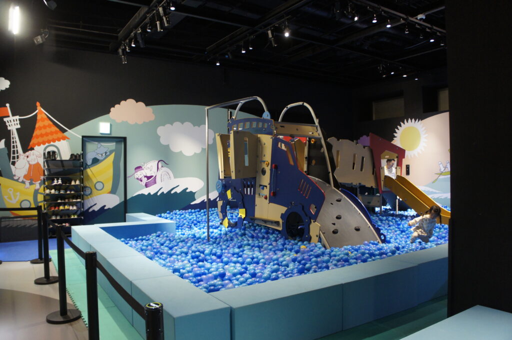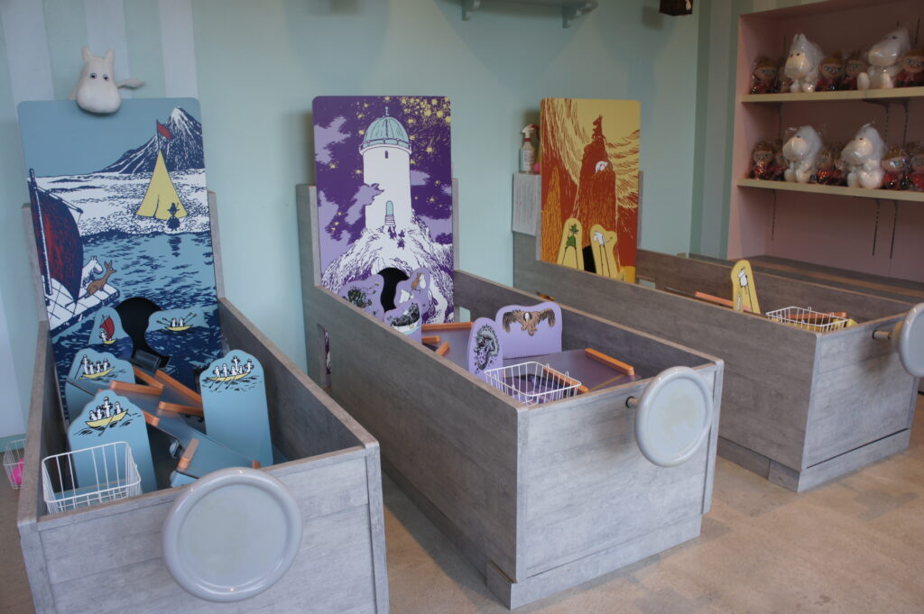 ムーミン谷エリア奥へ移動するとコケムスエリアは屋内あそび場や企画展など揃っています。コケムスはフィンランド語で体験を意味するムーミンの物語を追体験できる体験施設となっています。作者トーベ・ヤンソンの紹介、小説・絵本の世界、8メートルのムーミン谷のジオラマなど展示されています。