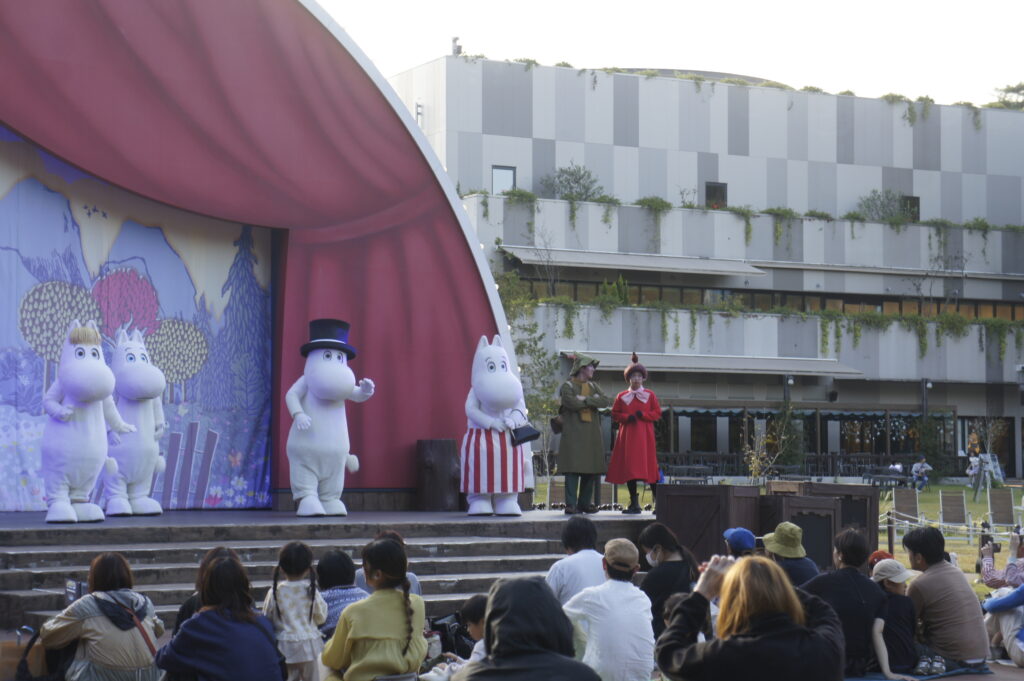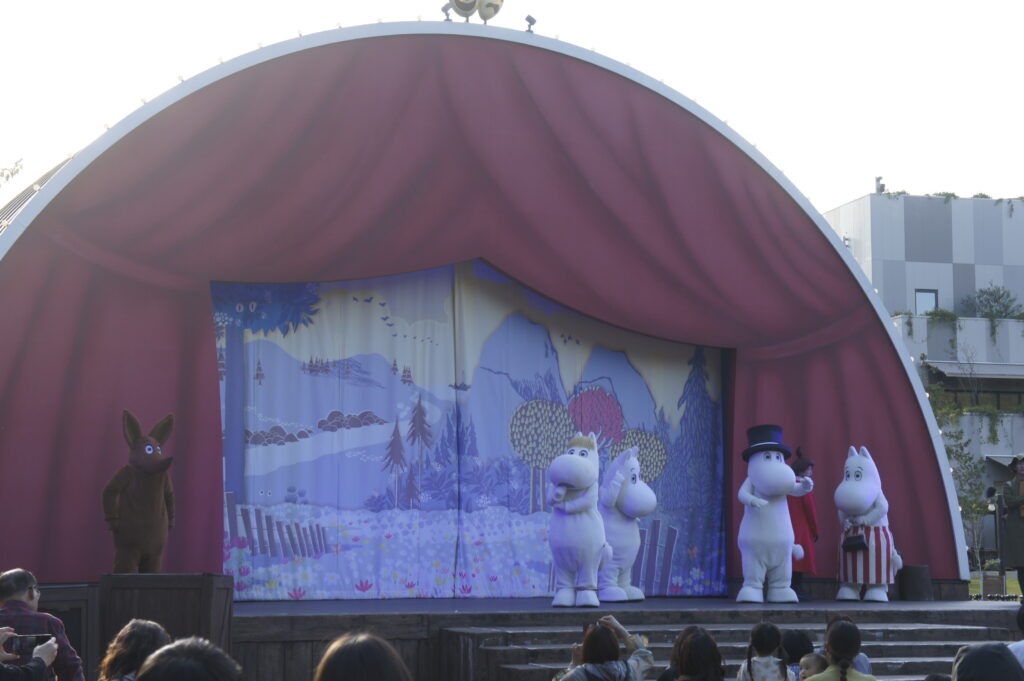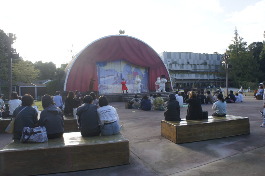 エンマの劇場ではムーミンやその仲間たちによるライブエンターテイメントショーが楽しめます。屋外の開放的な劇場でこころ癒されるショーをご覧ください。